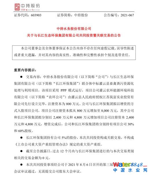 8月6日,中持股份(603903.SH)公布,公司擬與長江生態(tài)環(huán)保集團有限公司(“長江環(huán)保集團”)就灌云縣畜禽糞污資源化處理與利用項目成立項目公司灌云農環(huán)能源環(huán)境科技有限公司(“農環(huán)公司”)。