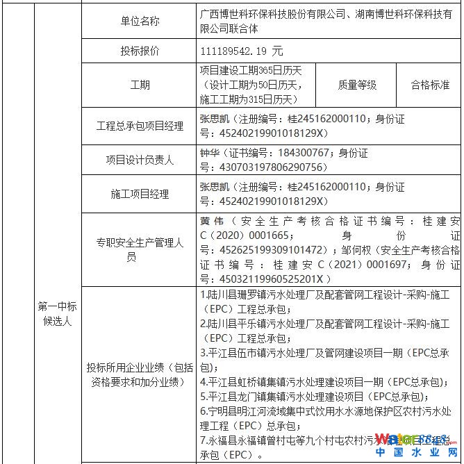 11 月3 日,全國(guó)公共資源交易平臺(tái)發(fā)布了《百色市右江區(qū)人居環(huán)境整治項(xiàng)目一期(EPC)工程總承包中標(biāo)候選人公示》,確定廣西博世科環(huán)保科技股份有限公司、湖南博世科環(huán)?萍加邢薰韭(lián)合體成為該項(xiàng)目的第一中標(biāo)候選人,中標(biāo)價(jià)為111189542.19 元。