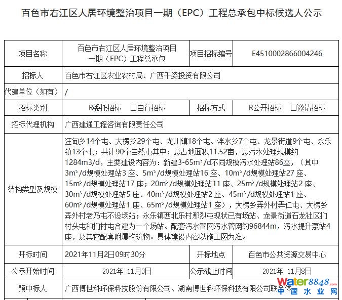 博世科預(yù)中標(biāo)廣西百色市右江區(qū)人居環(huán)境整治項(xiàng)目一期(EPC)工程總承包