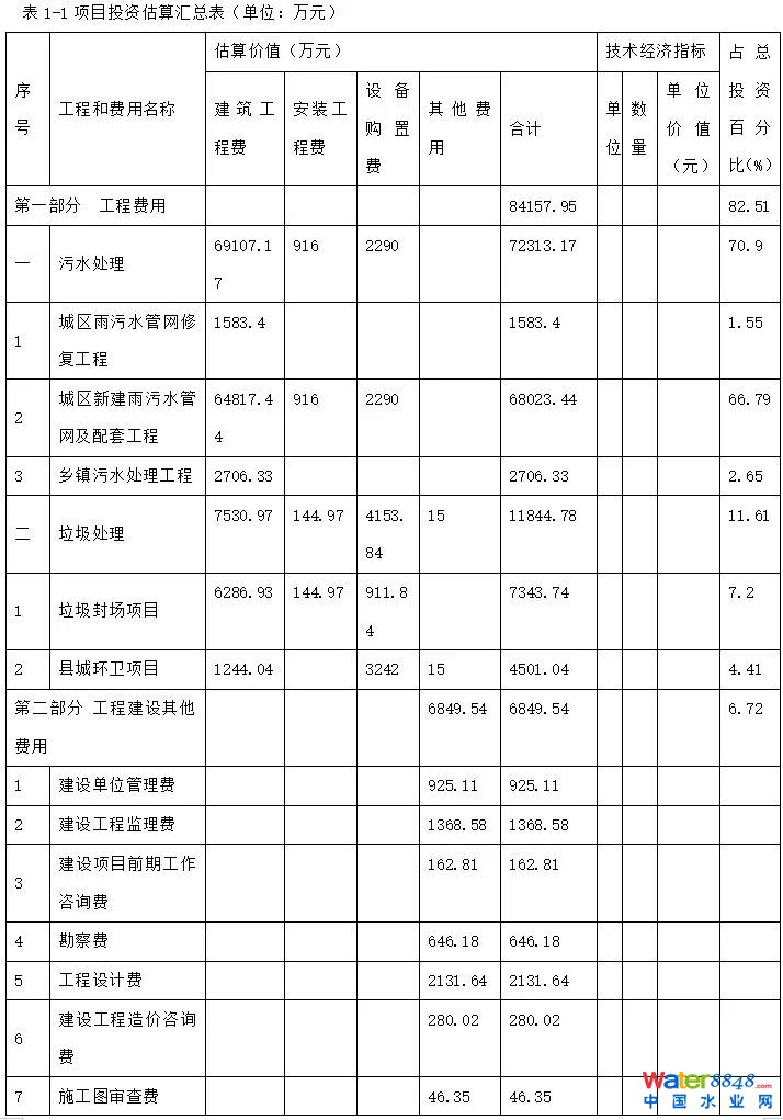 各子項(xiàng)目的建設(shè)投資金額為:其中,污水處理項(xiàng)目投資81706.16萬(wàn)元,垃圾處理項(xiàng)目投資13851.70萬(wàn)元,建設(shè)期利息6435萬(wàn)元。