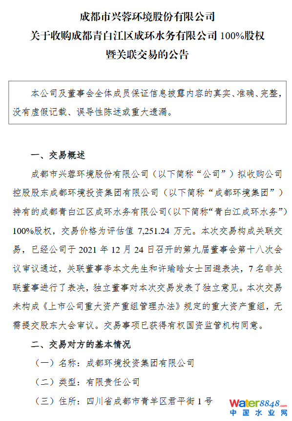 興蓉環(huán)境:擬以7251.24萬(wàn)元收購(gòu)青白江成環(huán)水務(wù)100%股權(quán)