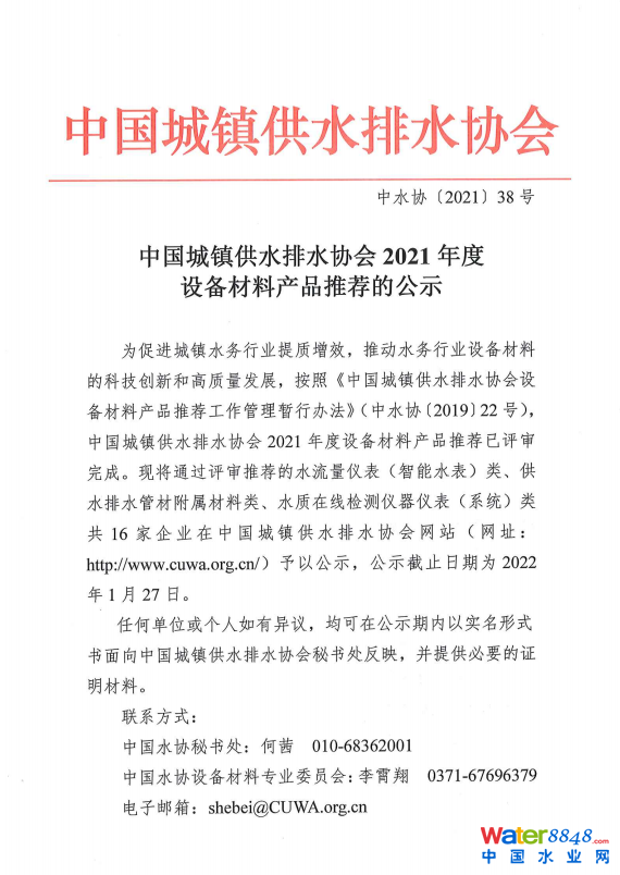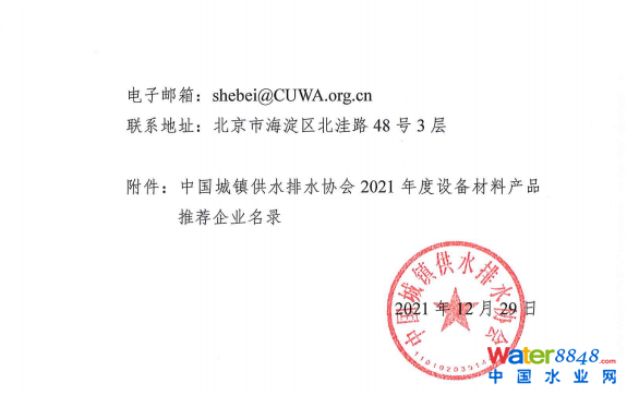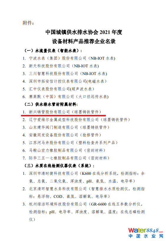 2021年12月29日,由中國城鎮(zhèn)供水排水協(xié)會組織開展的“2021年度設(shè)備材料產(chǎn)品推薦企業(yè)名錄”正式發(fā)布,新興鑄管股份有限公司球墨鑄鐵管件產(chǎn)品憑借優(yōu)異的產(chǎn)品質(zhì)量、良好的品牌影響力和客戶滿意度,作為唯一家球墨鑄鐵管及管件研發(fā)制造商再次入選推薦企業(yè)名錄。