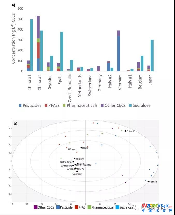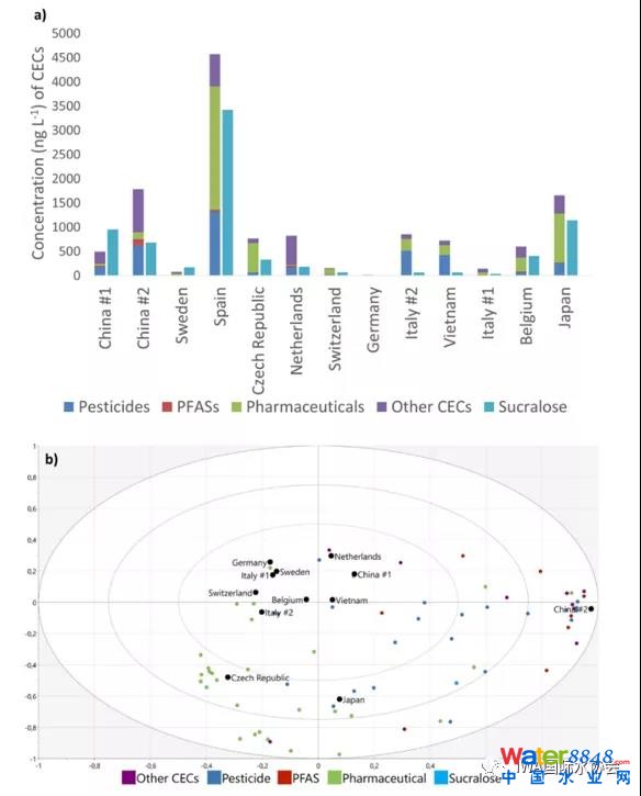 圖:飲用水廠凈化出水的CECs的濃度分布和主成分分析結(jié)果