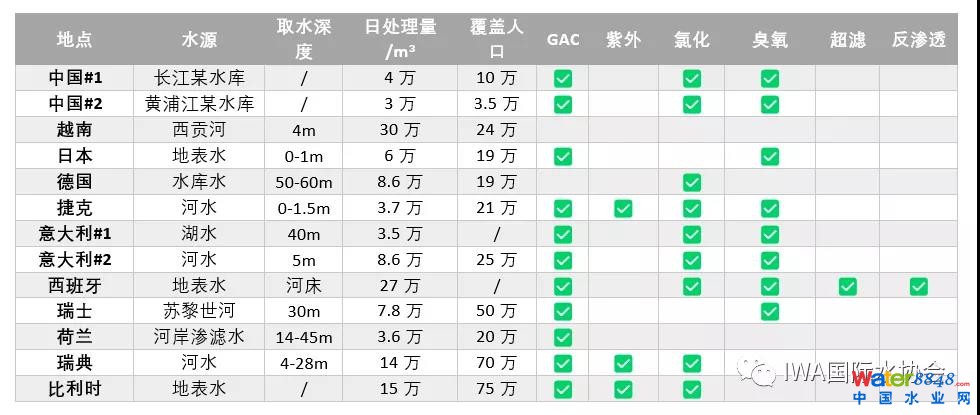 13座水廠的處理方法有所差別,其中有1座使用了超濾和反滲透,有11座運用了GAC活性炭過濾,有8座運用了高級氧化(臭氧)。