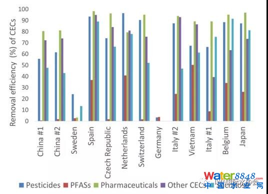 這13個水廠的平均去除效率為65±28%。與之相對應的是,去除率最高的水廠(89%,西班牙)的進水CECs濃度也是最高的,而平均去除效率最低(2.3%,德國)的水廠的進水CECs濃度也是最低的(進水只檢出6種物質(zhì))。