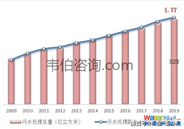 由于城鎮(zhèn)化和經(jīng)濟(jì)發(fā)展需求,中國城市近年來污水產(chǎn)生量和處理量呈上升趨勢。從城市污水處理情況來看,截至2019年底,全國城市污水處理廠處理能力1.77億立方米/日,累計處理污水量523億立方米。