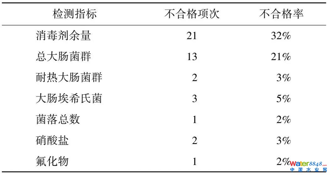 本次調查的61個村級供水樣品中,30個樣品不符合標準要求,31個樣品檢測指標均合格,樣品達標率為50.82%。如表2所示,不合格情況主要集中于消毒劑指標,不合格率達32%;其次為微生物指標,其中,總大腸菌群不合格率為21%,部分樣品也有大腸埃希氏菌、耐熱大腸菌群或菌落總數(shù)檢出;此外,少量樣品的硝酸鹽和氟化物指標不合格,不合格率低于5%。結果表明,消毒問題是影響該市村級供水水質達標、威脅飲用水安全的首要問題,硝酸鹽、氟化物等水源性污染是影響水質、造成健康危害的另一重要因素。