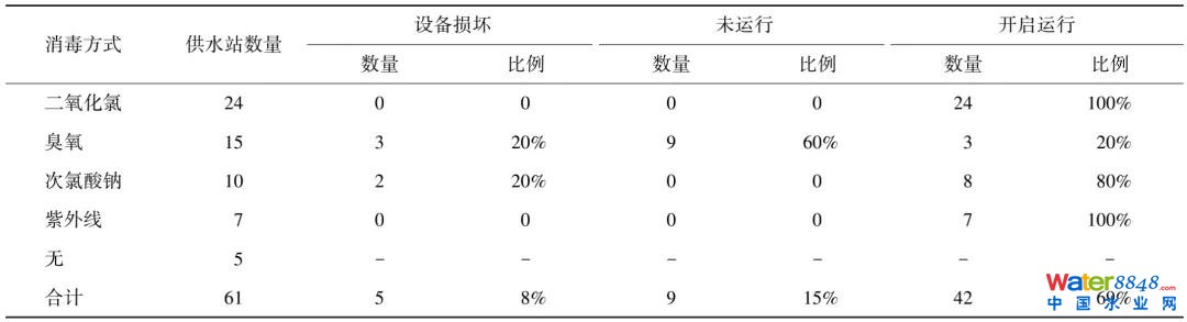 已安裝消毒設備的56個村級供水站中,42個供水站消毒設備開啟運行,占本次調查供水站總數(shù)的69%;5個供水站消毒設備損壞(臭氧和次氯酸鈉),占8%;9個供水站消毒設備未開啟(均為臭氧),占15%。其中,二氧化氯和紫外線消毒設備正常運行率為100%,次氯酸鈉消毒設備正常運行率為80%,臭氧消毒設備僅3套正常運行,正常運行率為20%。