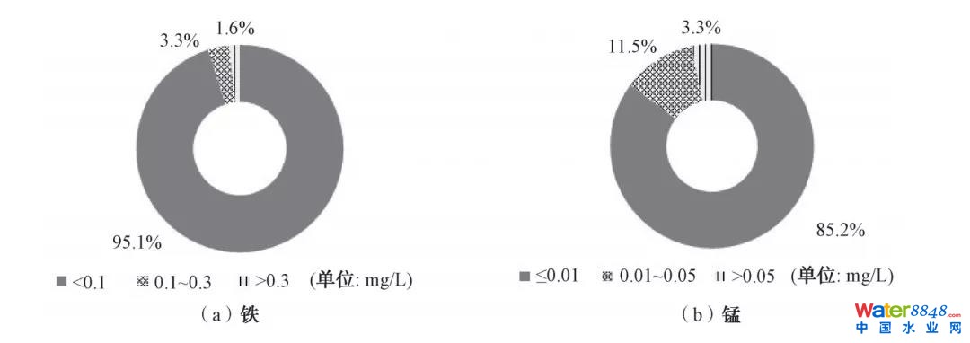 本研究調查的61個村級供水站的感官性狀和一般化學指標檢出情況如表5所示,所有樣品均無色、無味、澄清、未檢出肉眼可見物,pH值在7.05~8.42,耗氧量、鐵、錳含量檢出結果均符合《標準》要求。由圖1可知,本研究調查樣品中共有95.1%的樣品中鐵含量低于0.1 mg/L,85.2%的樣品中錳含量低于0.01 mg/L,大部分地區(qū)屬于低鐵、錳區(qū)域,不影響飲用水的可接受性。