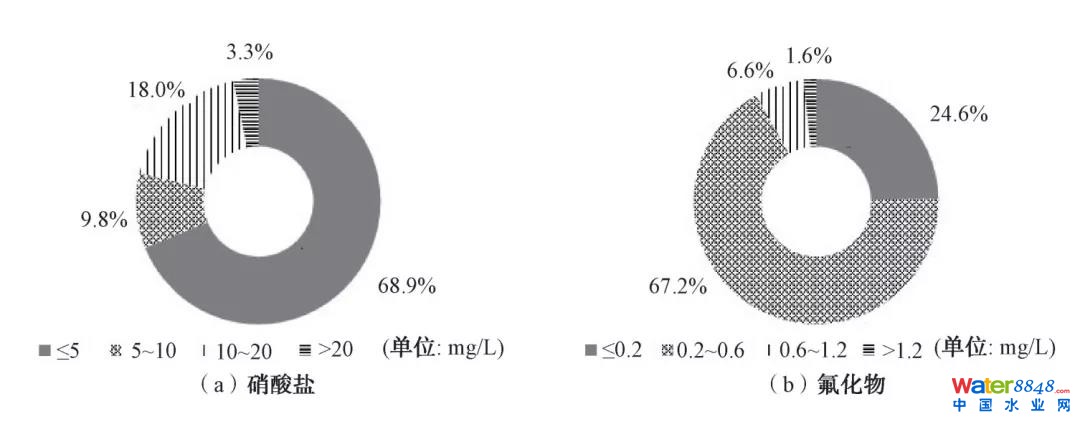 我國農村飲水工程普遍投入少、規(guī)模小,導致管理維護的難度較大,通常只經過簡單消毒且消毒效果不能保證。飲用水中細菌類、病毒類、寄生原蟲類等病原微生物可引起介水傳染病的發(fā)生和傳播,是威脅農村飲水安全的主要風險,同時,化學性污染帶來的長期慢性非傳染性疾病問題也值得關注。當硝酸鹽含量過高時,通過飲用水可對人體的健康造成影響,97%的高鐵血紅蛋白癥流行病學案例是在硝酸鹽含量超過10 mg/L的情況下發(fā)生的。WHO指出,在低劑量時,氟是人體可能必需的元素,但有潛在毒性,一定濃度的氟化物能有效預防齲齒,但攝入量大于6 mg/d時,可能對人體骨骼造成不利影響。當飲用水中砷的質量濃度≥10 μg/L時,飲用水會成為攝入的主要來源。國際化學品安全規(guī)劃署(IPCS)相關資料指出,長期暴露于含砷飲用水中會誘發(fā)皮膚、肺、膀胱、腎的癌癥,以及角化過度和色素變化等皮膚病變。