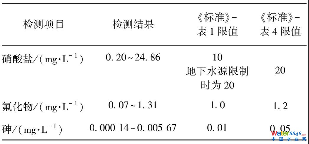 檢測方法依據《標準方法》;評價依據為《標準》,其中菌落總數(shù)、色度、渾濁度、pH、耗氧量、鐵、錳、砷、氟化物、硝酸鹽按照《標準》中表4規(guī)定的限值判定,其他指標按照《標準》中表1、表2判定。樣品中有1項指標超標,即判定為樣品不達標。