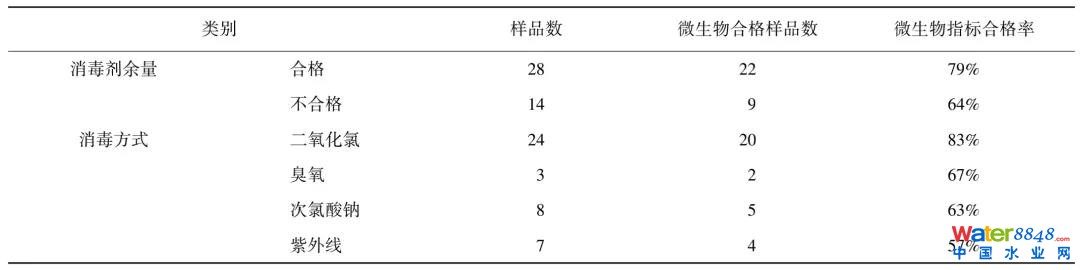 微生物指標合格率反映了飲用水的消毒效果。本次調查中共42個供水站消毒設備開啟運行,消毒劑余量和消毒方式對消毒效果的影響情況如表4所示。消毒劑余量合格的樣品中,微生物指標合格率為79%,高于消毒劑余量不合格的樣品(64%)。結果表明,控制消毒劑余量對防止微生物污染有重要作用,消毒的最終目標是殺滅已知和未知的病原體,但因為無法對水中的全部微生物進行檢測,只有水廠具備有效的消毒措施,才能消除可能存在的健康威脅,因此,消毒劑余量合格率也具有意義。而消毒劑余量合格樣品的微生物指標合格率未達到100%,也說明僅消毒劑余量合格不足以保證滅菌效果。