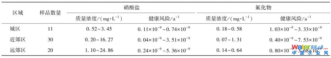 表7 硝酸鹽和氟化物空間分布及健康風險