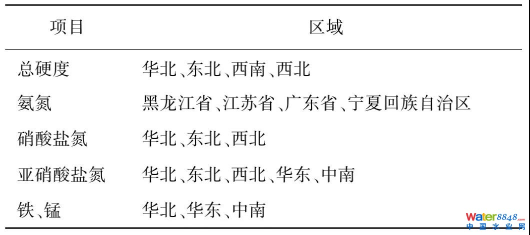 地下水是我國北方農村主要的飲用水水源。當?shù)叵滤艿轿廴竞螅捎谄渥詢裟芰Φ,水中的污染物將長期存在。全國31個省、市,5 000多個監(jiān)測井的地下水質結果顯示,華北、東北、華東、西北地區(qū)的地下水質較差,影響地下水源水質的主要指標為總硬度、溶解性總固體(TDS)、鐵、錳、“三氮”,其次為硫酸鹽、氯化物、氟化物等污染物,個別監(jiān)測點重金屬也存在不同程度的超標,主要污染物的分布區(qū)域如表1所示。華北平原6063組地下水樣品污染調查顯示,重金屬主要以點狀、線狀污染為主,其中砷含量普遍偏高,華北平原淺層、深層地下水中砷的超標率分別達12.97%和5.12%。