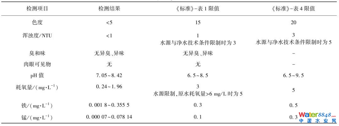 依據《生活飲用水衛(wèi)生標準》(GB 5749—2006)(以下簡稱《標準》),本研究共調查16項指標。其中,有總大腸菌群、耐熱大腸菌群、大腸埃希氏菌、菌落總數(shù)共4項微生物指標,色度、渾濁度、臭和味、肉眼可見物、pH、耗氧量、鐵、錳共8項感官性狀和一般化學指標,根據該城市典型水質特征重點關注了硝酸鹽(以N計)、砷、氟化物共3項毒理指標,消毒劑余量根據消毒方式確認。