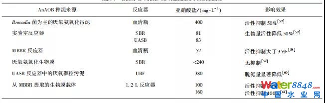 盡管NO2-是厭氧氨氧化過程的重要底物,但過量的NO2-累積在厭氧氨氧化系統(tǒng)內(nèi)時會對AnAOB有毒害作用。不同來源的AnAOB以及不同污水處理系統(tǒng)中NO2-的抑制濃度不同(表4)。此外,試驗發(fā)現(xiàn),反應(yīng)器中氨氮的存在與否也會顯著影響NO2-對AnAOB的毒害作用。在氨氮存在的條件下,抑制50%的AnAOB活性需要384mg/L的NO2--N。但在無氨氮的條件下,質(zhì)量濃度為53mg/L的NO2--N就能降低AnAOB一半的活性。