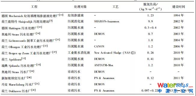 從20世紀90年代在荷蘭問世至今,厭氧氨氧化水處理技術(shù)不斷取得突破,實際工程應(yīng)用也在全球范圍內(nèi)迅速發(fā)展。如表1所示,處理對象已由工業(yè)廢水、污泥脫水液、垃圾滲濾液等高含氮廢水發(fā)展到市政污水處理等領(lǐng)域。2002年,荷蘭鹿特丹Dokhaven市政污水處理廠采用兩段式SHARON-Anammox工藝處理該廠污泥消化液,建設(shè)了全球第一座生產(chǎn)性厭氧氨氧化反應(yīng)器。之后,瑞典馬爾默Sjölunda廢水處理廠采用ANITATM-Mox工藝處理污泥脫水液,荷蘭Apeldoorn采用DEMON工藝對厭氧消化液進行處理,美國Alex-andria的污水處理廠等采用厭氧氨氧化作為污水處理側(cè)流工藝。