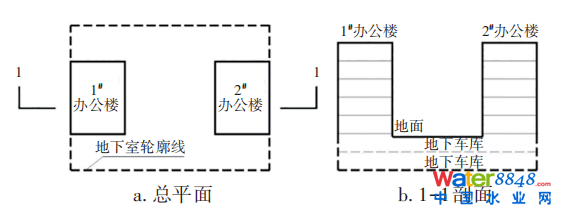某大底盤地下車庫(kù)地面以上有若干棟滿足防火間距的多層辦公樓,辦公樓的電梯和樓梯由甲級(jí)防火門與地下車庫(kù)連通(見圖1)。對(duì)于該類項(xiàng)目的室外消火栓設(shè)計(jì)流量的計(jì)算,設(shè)計(jì)中出現(xiàn)如表1所示的兩種相差較大的計(jì)算參數(shù)。