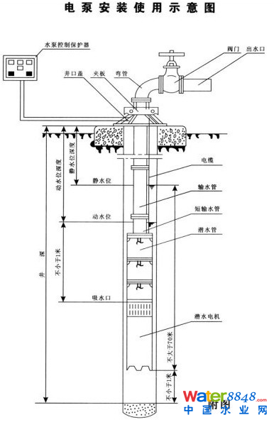 b) . 水泵進水口必須在動水位1米位以下,但潛水不得超過靜水位以下70米,電機下端距井底水深在1米以上。