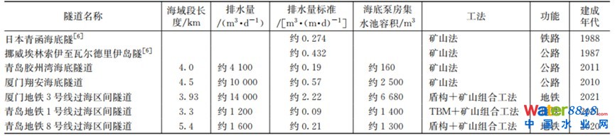 國(guó)內(nèi)目前已建成的主要礦山法海底隧道主要有公路隧道,青島膠州灣海底隧道、廈門翔安海底隧道;地鐵區(qū)間,青島地鐵1號(hào)線過海區(qū)間隧道、青島地鐵8號(hào)線過海區(qū)間隧道、廈門地鐵3號(hào)線過海區(qū)間隧道。其海底泵房集水池容積,詳見表2,國(guó)內(nèi)外礦山法或組合工法礦山段海底隧道情況。從表2中公路過海隧道和地鐵過海區(qū)間隧道的集水池容積來看,均考慮了一定規(guī)模的儲(chǔ)備容積,用于特定情況下的安全儲(chǔ)備。