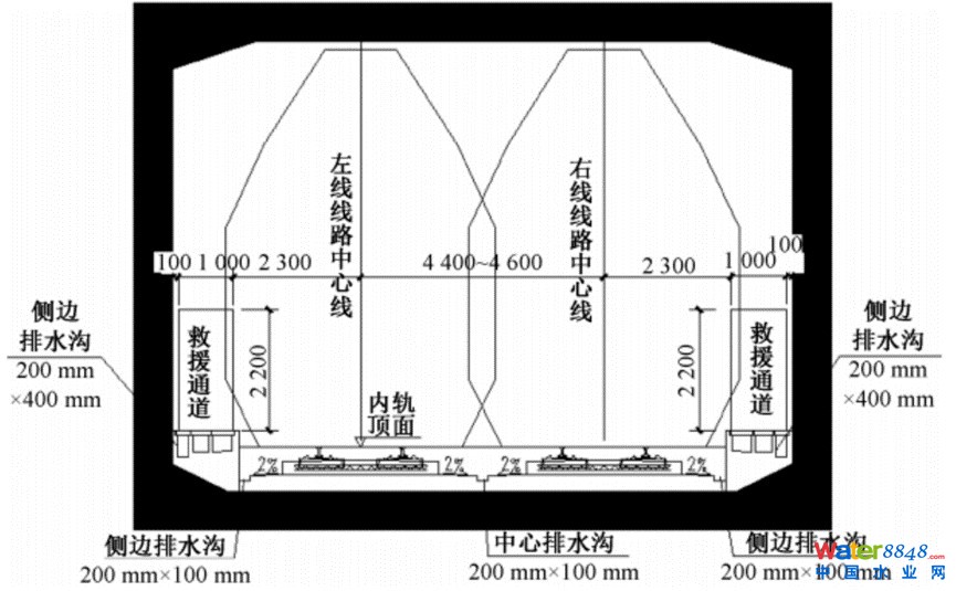 (3)礦山段排水布置。礦山段隧道內(nèi)排水采用側(cè)溝和中心蓋板溝的方式?窟厜(cè)左右縱向設(shè)置兩道邊墻側(cè)溝,側(cè)溝主要用于匯集地下水,并將地下水引入中心蓋板溝,同時(shí)起到沉淀兼顧部分排水的作用。中心蓋板溝縱向設(shè)置,主要用于排水,同時(shí)匯集道床頂部積水。