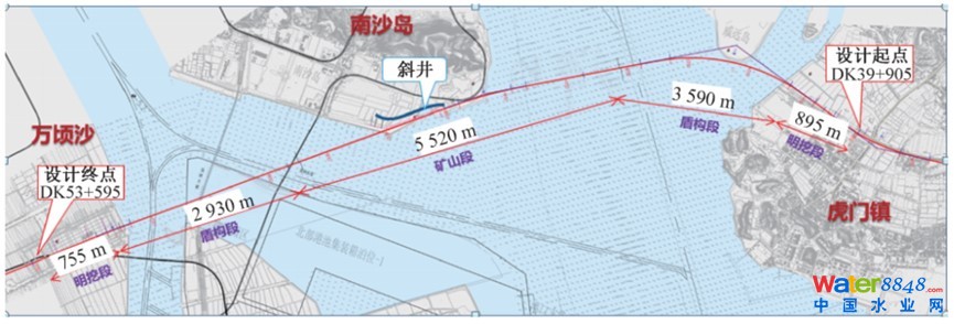 深圳至江門鐵路起自深圳樞紐西麗站(不含),經(jīng)深圳寶安、東莞虎門、廣州南沙、中山終至江門站(含)。珠江口鐵路隧道是新建深圳至江門鐵路的重點(diǎn)工程,位于珠江口,連接?xùn)|莞虎門和廣州南沙。工程線路長(zhǎng)13.69km,水域段長(zhǎng)約11km,為特長(zhǎng)隧道工程,詳見圖1。