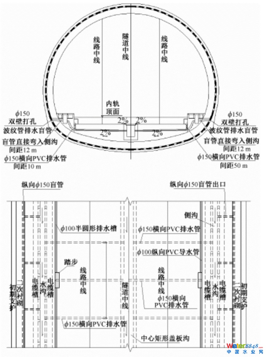 隧道襯砌拱墻防水板背后環(huán)向設(shè)置塑料排水板排水,縱向間距3~6m;防水板下端墻腳處設(shè)置縱向防結(jié)晶HDPE150雙壁打孔波紋管盲管,縱向盲管每隔12m分段引入側(cè)溝。環(huán)向盲溝與縱向盲溝均直接與隧道側(cè)溝連通,便于排水管路的維護(hù)。側(cè)溝與中心水溝通過橫向?qū)苓B接,每隔10m設(shè)置一道。仰拱填充靠?jī)蓚?cè)溝槽側(cè)壁位置設(shè)置半圓形排水槽,每50m設(shè)置硬質(zhì)PVC排水管與中心蓋板溝連通,以排除隧道內(nèi)道床可能產(chǎn)生積水。