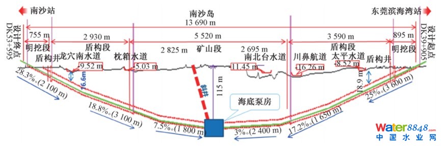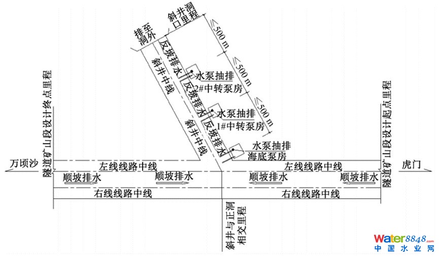 珠江口隧道為高速鐵路隧道,單洞雙線,縱斷面為V型坡。隧道采用明挖+盾構(gòu)+礦山法組合工法施工建設(shè)。中間礦山法段,長(zhǎng)為5.52km,南沙島設(shè)置一處1.16km長(zhǎng)的斜井;兩端采用盾構(gòu)和明挖施工,在萬頃沙及虎門側(cè)各設(shè)置盾構(gòu)始發(fā)井一座,虎門側(cè)盾構(gòu)長(zhǎng)3.59km,萬頃沙側(cè)盾構(gòu)長(zhǎng)2.93km,明挖段長(zhǎng)1.65km。隧道線路最低點(diǎn)位于斜井與隧道正線交接點(diǎn)附近,隧底最大埋深約115m。在隧道V型坡最低點(diǎn)斜井接入正洞斜井側(cè)設(shè)海底廢水泵房見圖2。