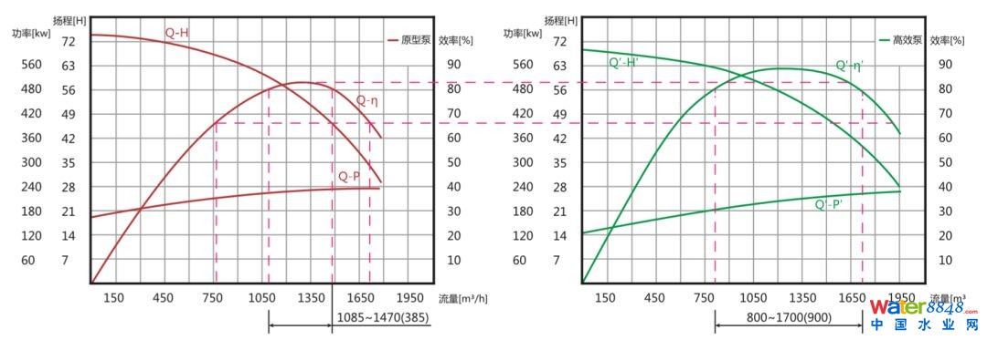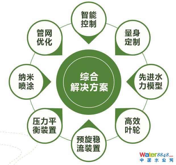 (1)保證改造后流量、揚程等關(guān)鍵指標(biāo)不變 ;(2)通過專利技術(shù)大幅度提升水泵運行效率 ;(3)通過工藝節(jié)能減少系統(tǒng)能量損失,實現(xiàn)按需供水