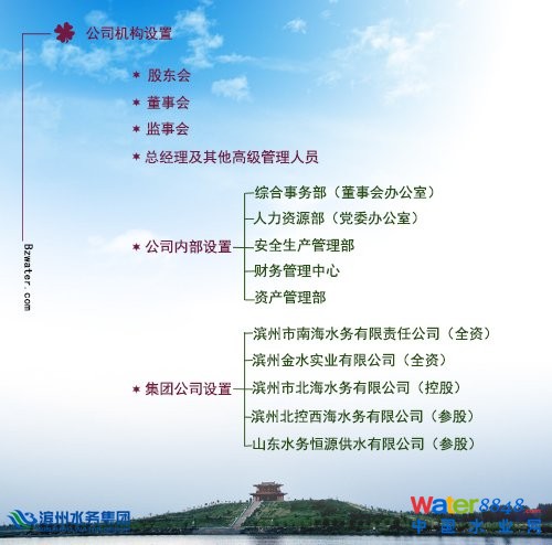 濱州水務(wù)集團有限公司成立于2010年1月,由山東水務(wù)投資有限公司與濱州水利發(fā)展有限公司出資組建(山東水務(wù)持有股份55.31%、濱州水發(fā)持有股份44.69%),注冊資本金1.5億元,資產(chǎn)總額5.8億元,是以城鄉(xiāng)供水為主的國有公司。集團公司內(nèi)設(shè)綜合事務(wù)部、人力資源部、安全生產(chǎn)管理部、財務(wù)管理中心、資產(chǎn)管理部5個部門;共有2個全資子公司(濱州市南海水務(wù)有限責任公司、濱州金水實業(yè)有限公司),1個控股公司(濱州市北海水務(wù)有限公司),2個參股公司(濱州北控西海水務(wù)有限公司、山東水務(wù)恒源供水有限公司),員工123人。
