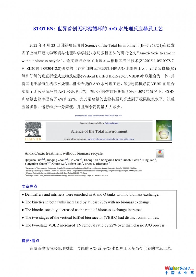STOTEN: 世界首創(chuàng)無污泥循環(huán)的A/O水處理反應器及工藝