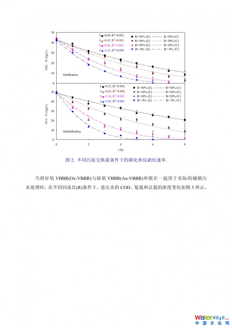 本研究首先從實驗室小試開始,分別設計了有、無污泥交換的硝化和反硝化實驗來模擬傳統(tǒng)A/O水處理工藝的泥水循環(huán)情況。研究發(fā)現(xiàn),相比有50%的污泥交換,無污泥交換時,硝化和反硝化反應速率要快1.5倍和4.2倍,該實驗結果如圖2所示。