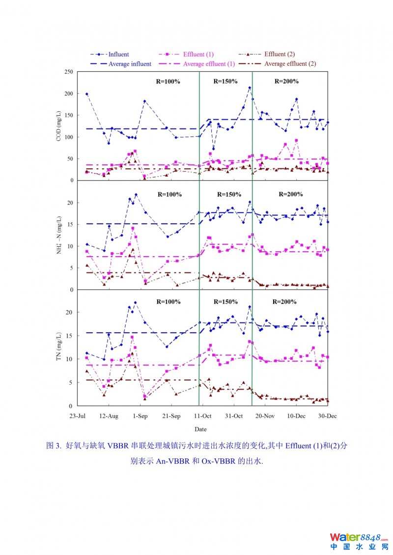 當將好氧VBBR(Ox-VBBR)與缺氧VBBR(An-VBBR)串聯(lián)在一起用于實際的城鎮(zhèn)污水處理時,在不同回流比(R)條件下,進出水的COD、氨氮和總氮的濃度變化如圖3所示。