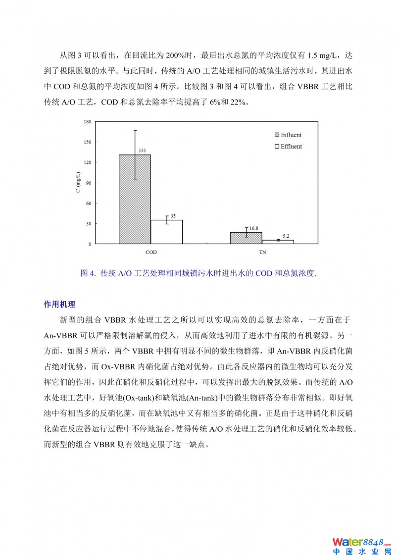 新型的組合VBBR水處理工藝之所以可以實現(xiàn)高效的總氮去除率,一方面在于An-VBBR可以嚴格限制溶解氧的侵入,從而高效地利用了進水中有限的有機碳源。另一方面,如圖5所示,兩個VBBR中擁有明顯不同的微生物群落,即An-VBBR內(nèi)反硝化菌占絕對優(yōu)勢,而Ox-VBBR內(nèi)硝化菌占絕對優(yōu)勢。由此各反應器內(nèi)的微生物均可以充分發(fā)揮它們的作用,因此在硝化和反硝化過程中,可以發(fā)揮出最大的脫氮效果。而傳統(tǒng)的A/O水處理工藝中,好氧池(Ox-tank)和缺氧池(An-tank)中的微生物群落分布非常相似。即好氧池中有相當多的反硝化菌,而在缺氧池中又有相當多的硝化菌。正是由于這種硝化和反硝化菌在反應器運行過程中不停地混合,使得傳統(tǒng)A/O水處理工藝的硝化和反硝化效率較低。而新型的組合VBBR則有效地克服了這一缺點。