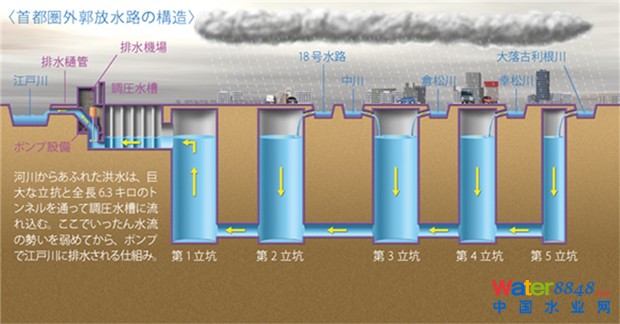 1992—2007年,日本投資2400億日元(約合140億元人民幣),在東京北郊琦玉縣境內(nèi)建設(shè)名為“首都圈外郭放水路”的巨型分洪工程。