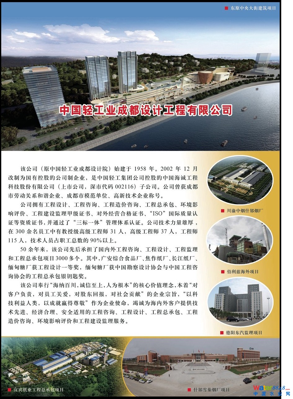 中國輕工業(yè)成都設(shè)計工程有限公司(原中國輕工業(yè)成都設(shè)計院)始建于1958年9月,2002年12月改制為國有控股公司,中國保利集團公司下屬企業(yè),系中國輕工集團有限公司所屬的上市公司“中國海誠工程科技股份有限公司”(深市代碼002116)的全資子公司,是從事工程咨詢、設(shè)計、監(jiān)理、工程總承包的科技服務(wù)型企業(yè)。公司通過質(zhì)量、環(huán)境、職業(yè)健康安全管理體系認(rèn)證,系“高新技術(shù)企業(yè)”、“四川省重合同守信用企業(yè)”、“成都市模范單位”和“成都市勞動關(guān)系和諧企業(yè)”。