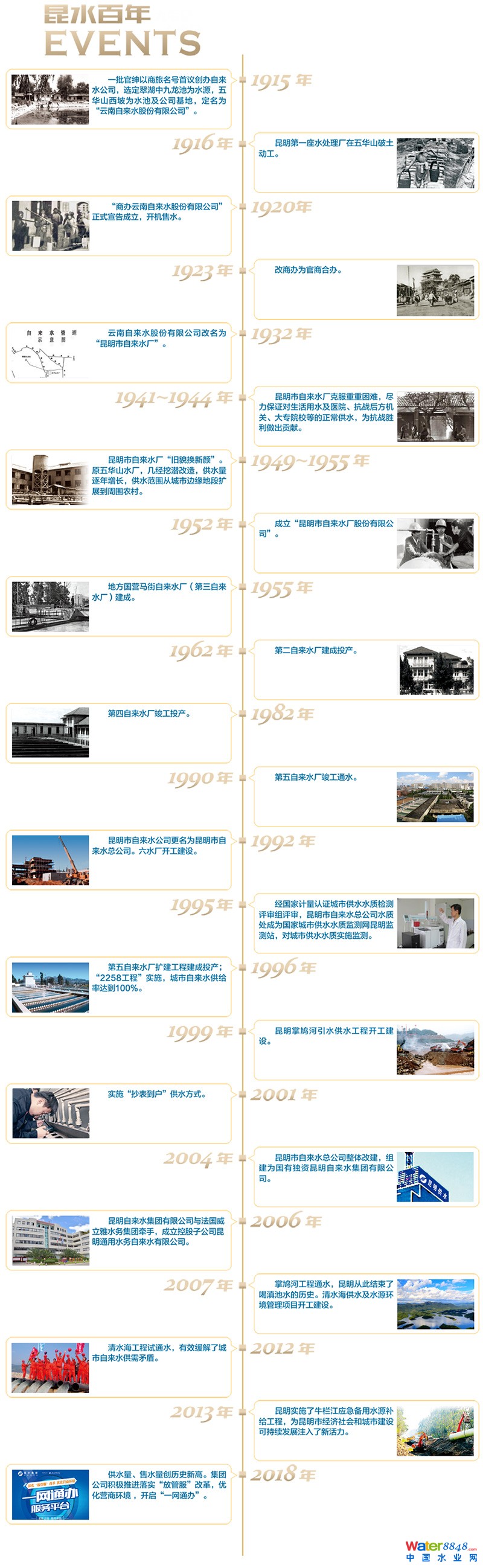 水,滋養(yǎng)城市的生命,蘊含城市的歷史,孕育城市的靈氣,見證城市的變遷。從1915年至今,昆明城市供水事業(yè)已經(jīng)走過了一百多年的光輝歲月。百年的滄桑巨變,百年的興衰榮耀,百年的歷史積淀,昆明供水事業(yè)從艱難起步到曲折發(fā)展,從積極創(chuàng)新到跨越發(fā)展,尤其是近20年來從蒸蒸日上到蓬勃發(fā)展,昆明城市供水企業(yè)在昆明社會經(jīng)濟和城市發(fā)展的歷程中,發(fā)揮了舉足輕重的作用,成為了春城發(fā)展史這幅美麗畫卷中濃墨重彩的一筆。
