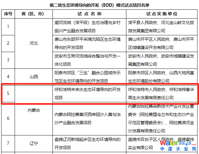 2022年4月28日,生態(tài)環(huán)境部、發(fā)展改革委與國(guó)家開(kāi)發(fā)銀行聯(lián)合發(fā)布第二批58個(gè)生態(tài)環(huán)境導(dǎo)向的開(kāi)發(fā)(EOD)模式試點(diǎn)項(xiàng)目名單。為深入貫徹落實(shí)黨中央、國(guó)務(wù)院關(guān)于全面加強(qiáng)生態(tài)環(huán)境保護(hù)、深入打好污染防治攻堅(jiān)戰(zhàn)的決策部署,中國(guó)水環(huán)境集團(tuán)與呼和浩特市人民政府共同打造呼和浩特未來(lái)水生態(tài)環(huán)境導(dǎo)向的開(kāi)發(fā)項(xiàng)目,深入探索EOD模式,持續(xù)推進(jìn)環(huán)境治理模式創(chuàng)新。該項(xiàng)目作為第二批EOD模式試點(diǎn)項(xiàng)目正式啟動(dòng),將有力推進(jìn)生態(tài)產(chǎn)品價(jià)值進(jìn)一步實(shí)現(xiàn)。