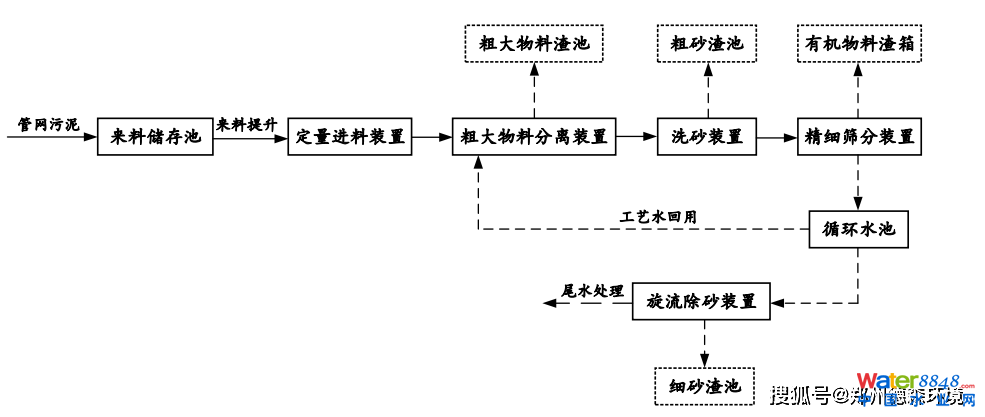 通溝污泥處理系統(tǒng)一般包括定量進(jìn)料、粗大物料分離、洗砂、精細(xì)篩分、工藝水回用、旋流除砂等環(huán)節(jié),工藝流程一般如下: