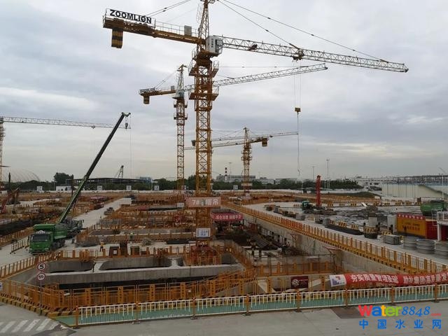 在海徐路附近竹園第一污水處理廠西側(cè)的一處工地上,吊機(jī)高聳、車輛穿梭,一座亞洲最大的合流制污水調(diào)蓄池正在緊張施工中。