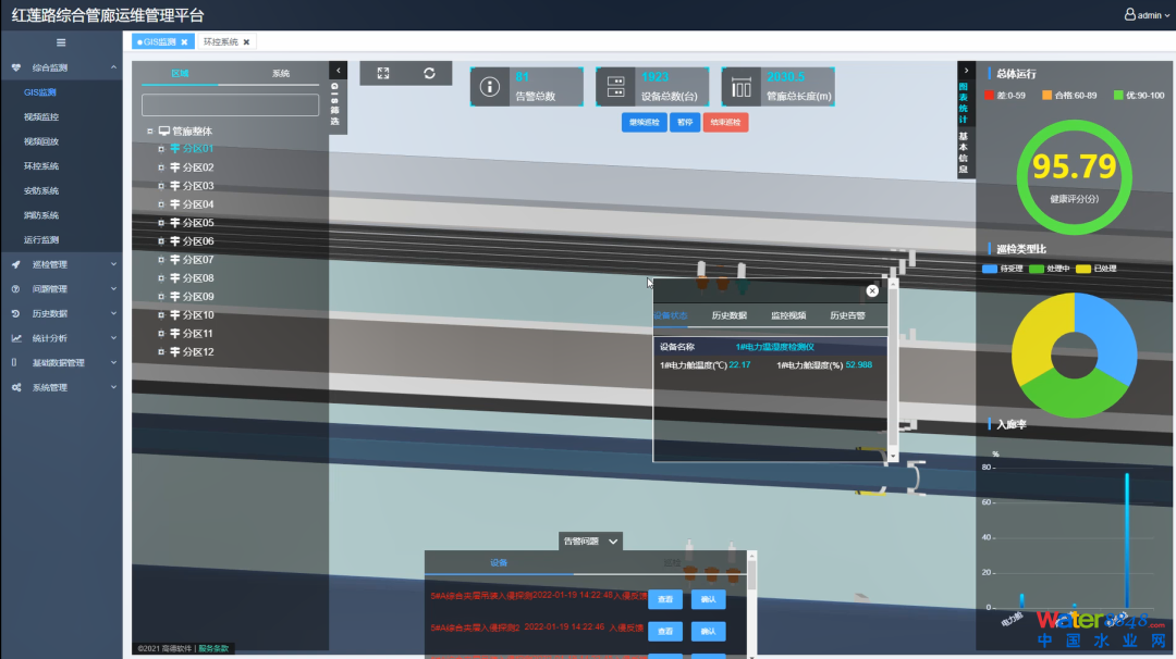 廣州南沙區(qū)紅蓮路縱隔管廊總長2.13公里,是目前南沙區(qū)內規(guī)模最大的綜合管廊。根據(jù)該項目現(xiàn)場實際情況,公司為其量身打造了一套綜合管廊智慧化運維管理解決方案,包括設備監(jiān)控系統(tǒng)設計、安防系統(tǒng)設計、通信系統(tǒng)設計、地理信息系統(tǒng)及統(tǒng)一管理信息平臺設計等服務。自綜合管廊監(jiān)控管理平臺應用以來,運行穩(wěn)定,降低了人工成本,提高了管理效率,深受用戶好評。
