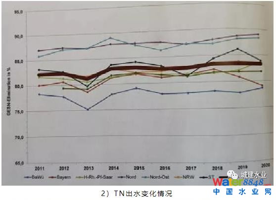 與先前調(diào)查相比,污染物凈化效果沒(méi)有太大變化,但是營(yíng)養(yǎng)物,特別是磷的去除效果略有提高,詳細(xì)調(diào)查結(jié)果見(jiàn)表2。各地區(qū)相比較,德國(guó)北部、東北部州的氮和磷的去除率較高。這些州進(jìn)水中COD、營(yíng)養(yǎng)物的濃度較高是與其分流制占比很高密切相關(guān),詳見(jiàn)圖1,德國(guó)排水體制分布圖。圖中數(shù)字是該地區(qū)合流制占比,以薩爾州最高,合流制比例達(dá)92.1%;以勃蘭登堡州最低,為3.9%。東西向橫線是被稱為“排水體制赤道線”,該線在逐步向北移動(dòng),說(shuō)明原東德地區(qū)在排水系統(tǒng)建設(shè)和改造中更多采用了分流制。