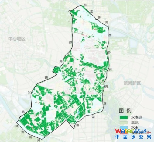 。2)農(nóng)業(yè)源。區(qū)域耕地面積為166平方公里,其中東麗區(qū)27平方公里,津南區(qū)94平方公里,西青區(qū)26平方公里,濱海新區(qū)18平方公里,寧河區(qū)1平方公里。耕地面積中基本農(nóng)田75.86平方公里,占耕地面積的45.78%。耕地包括水澆地164.79平方公里、水田0.78平方公里及旱地0.01平方公里,分布范圍如圖2-3所示,主要集中于試點范圍內(nèi)中部和南部區(qū)域。區(qū)域內(nèi)現(xiàn)有規(guī)模化畜禽養(yǎng)殖場主要養(yǎng)殖品種為生豬和肉雞、蛋雞。區(qū)域內(nèi)水產(chǎn)養(yǎng)殖面積8.7平方公里(約1.3萬畝),多分布于河湖附近,對水質(zhì)產(chǎn)生一定影響。種植業(yè)節(jié)水力度不足,如津南區(qū)農(nóng)田灌溉水有效利用系數(shù)僅為0.54。農(nóng)業(yè)源仍是區(qū)域內(nèi)重要的污染來源。