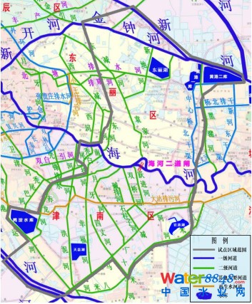 試點區(qū)域位于海河流域中下游,中心城區(qū)和濱海新區(qū)之間,永定新河匯水區(qū)與獨流減河匯水區(qū)圍合的范圍,總面積約800平方公里。區(qū)域內(nèi)現(xiàn)有16個街鎮(zhèn),46個村。包括一級河道4條,總長57.9km,分別為永定新河、獨流減河、新開—金鐘河和海河。二級河道22條,總長268.4km,其中海河以北7條,海河以南15條。主要湖庫5座,總庫容1.39億m3。