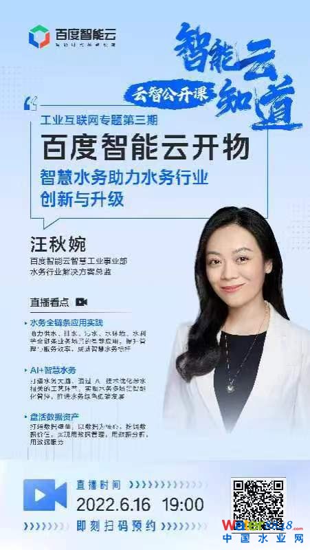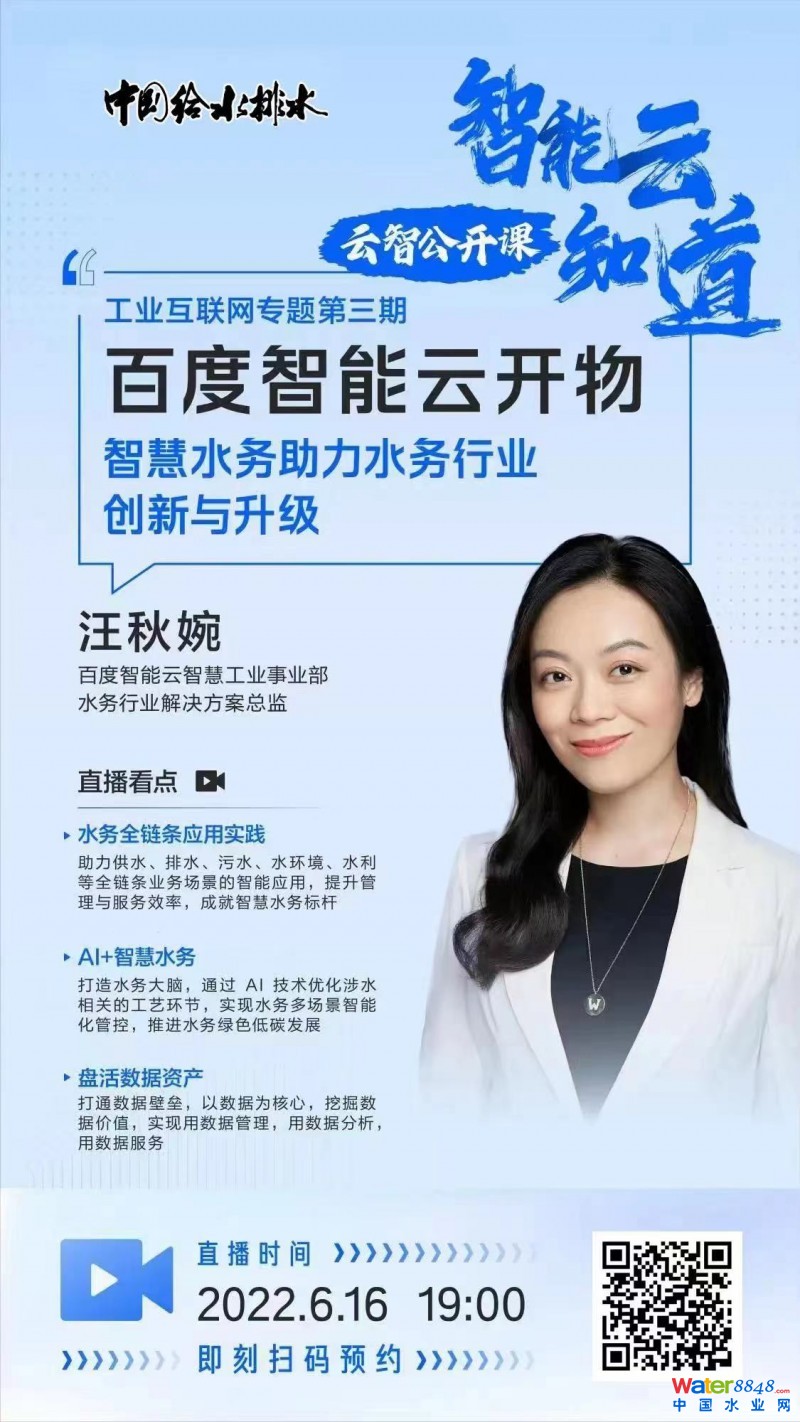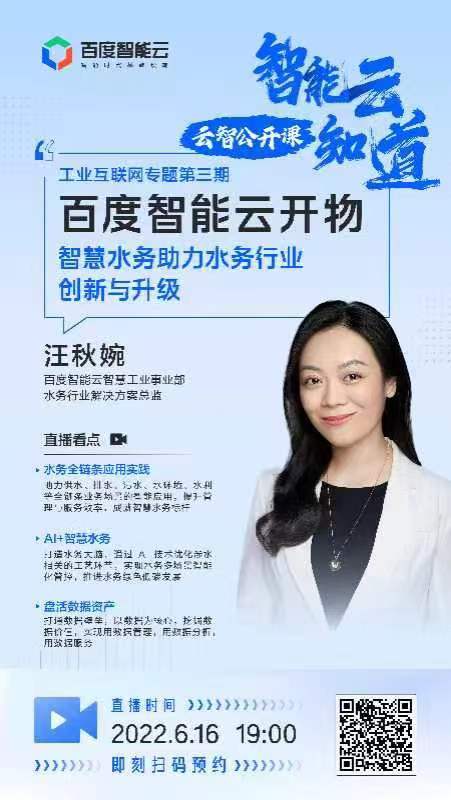 2022年6月16日19點(diǎn), "智能云知道-云智公開(kāi)課"工業(yè)互聯(lián)網(wǎng)專場(chǎng)第三期——智慧水務(wù)助力水務(wù)行業(yè)創(chuàng)新與升級(jí)線上直播將準(zhǔn)時(shí)上線,邀請(qǐng)您與百度智能云智慧工業(yè)事業(yè)部水務(wù)行業(yè)解決方案總監(jiān)汪秋婉一起,探討百度智能云智慧水務(wù)優(yōu)勢(shì)、應(yīng)用場(chǎng)景與實(shí)踐。