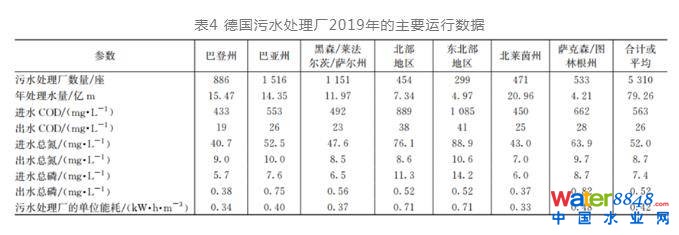 國(guó)內(nèi)污水處理廠的能耗水平與歐美發(fā)達(dá)國(guó)家相比究竟怎樣呢?國(guó)內(nèi)文獻(xiàn)中較多出現(xiàn)的觀點(diǎn)是國(guó)內(nèi)污水處理廠的能耗水平明顯高于歐美發(fā)達(dá)國(guó)家。但筆者認(rèn)為未必如此,污水處理廠的能耗水平與其建設(shè)標(biāo)準(zhǔn)和處理標(biāo)準(zhǔn)直接相關(guān),不是同一基礎(chǔ)上的數(shù)據(jù)不具有可比性。國(guó)內(nèi)污水處理廠經(jīng)歷近十年的逐次提標(biāo),目前的處理標(biāo)準(zhǔn)應(yīng)該已超過(guò)了很多歐美國(guó)家的污水處理廠。為滿足高標(biāo)準(zhǔn)的處理需求,近十年來(lái)也從國(guó)外引進(jìn)了大量的先進(jìn)技術(shù)和裝備,應(yīng)該說(shuō)目前行業(yè)內(nèi)國(guó)際上大多數(shù)先進(jìn)的工藝、技術(shù)和裝備在國(guó)內(nèi)都得到了廣泛的應(yīng)用。因此至少單純?cè)谖鬯幚韽S運(yùn)行能耗方面國(guó)內(nèi)并不比歐美發(fā)達(dá)國(guó)家差。唐建國(guó)在城建水業(yè)上介紹了德國(guó)2019年的污水處理情況,德國(guó)水協(xié)2019年調(diào)查了全德5 310座污水處理廠的情況,占德國(guó)污水處理總規(guī)模的87.2%。其中關(guān)于污水處理廠的主要運(yùn)行數(shù)據(jù)摘錄如表4所示。