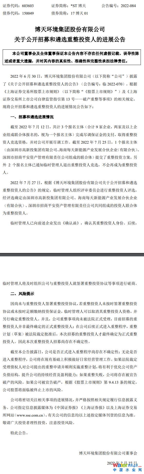 2022年7月27日,博天環(huán)境發(fā)布《關(guān)于公開招募和遴選重整投資人的進(jìn)展公告》,博天環(huán)境重整計(jì)劃再獲新進(jìn)展。從本次公告獲悉: