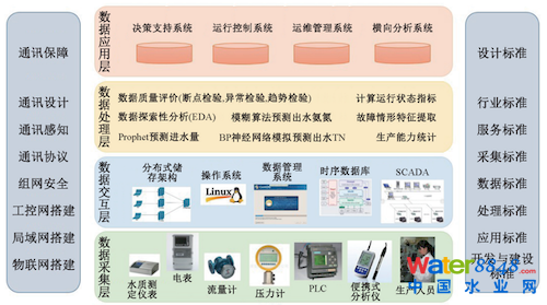 為逐步實(shí)施上述階段,智慧水務(wù)平臺(tái)的搭建依賴于計(jì)算機(jī)輔助技術(shù)(IT)和業(yè)務(wù)技術(shù)(OT)這兩方面的技術(shù)。計(jì)算機(jī)輔助技術(shù)包括:數(shù)據(jù)的采集、通訊、儲(chǔ)存、調(diào)用與搜索;數(shù)據(jù)庫(kù)的建立與備份;數(shù)據(jù)結(jié)構(gòu)標(biāo)準(zhǔn)化處理,數(shù)據(jù)關(guān)系分析技術(shù),異常值清洗技術(shù)、缺省值插入技術(shù)及數(shù)據(jù)展示技術(shù)等。業(yè)務(wù)技術(shù)主要包括相關(guān)事件監(jiān)測(cè)與統(tǒng)計(jì)、事件間關(guān)聯(lián)分析、事件預(yù)防預(yù)警、事件診斷與響應(yīng)、策略優(yōu)化等。