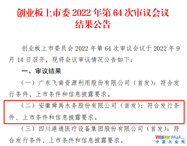 創(chuàng)業(yè)板上市委9月14日召開2022年第64次審議會議,審議結(jié)果顯示,安徽舜禹水務股份有限公司首發(fā)獲通過。