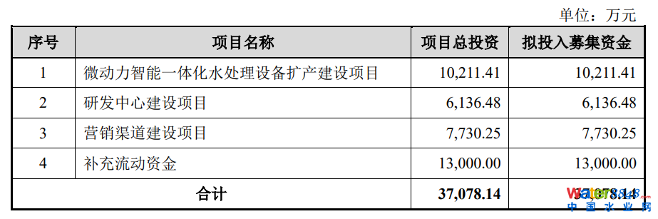 本次IPO,舜禹水務擬發(fā)行數(shù)量不超過4116萬股人民幣普通股(A股),擬募資約3.71億元,將用于微動力智能一體化水處理設備擴產(chǎn)建設項目、研發(fā)中心建設項目、營銷渠道建設項目建設,以及補充流動資金。